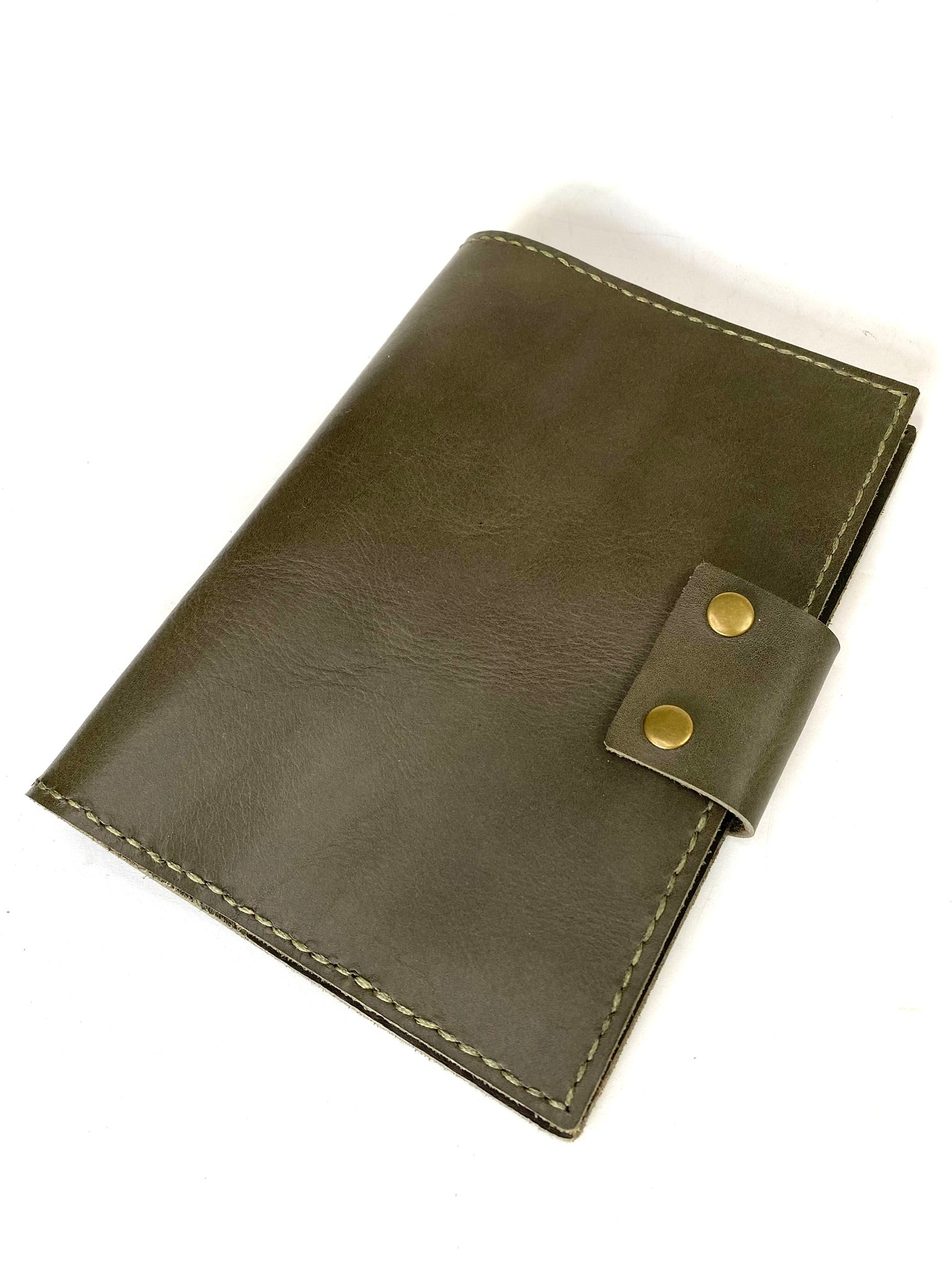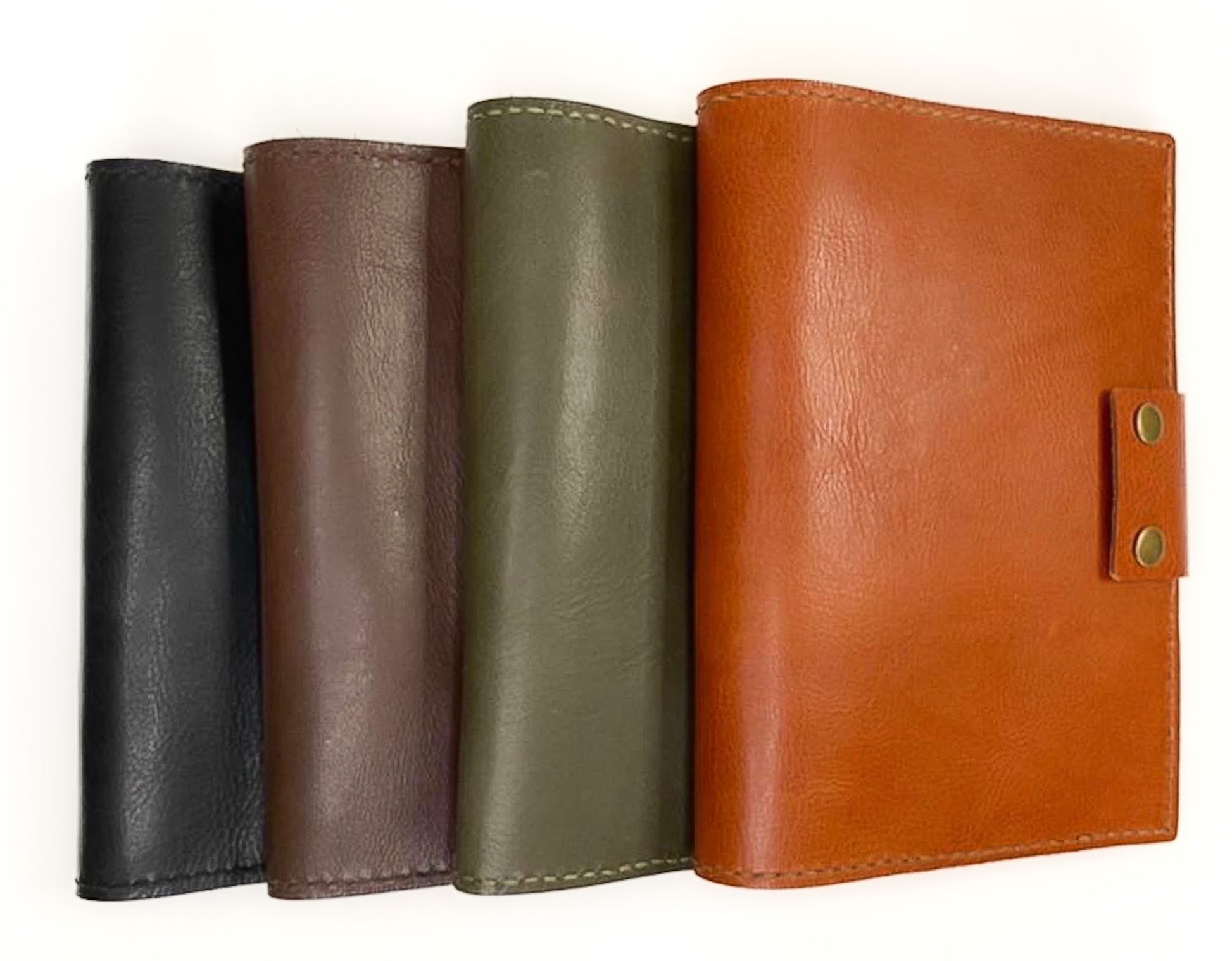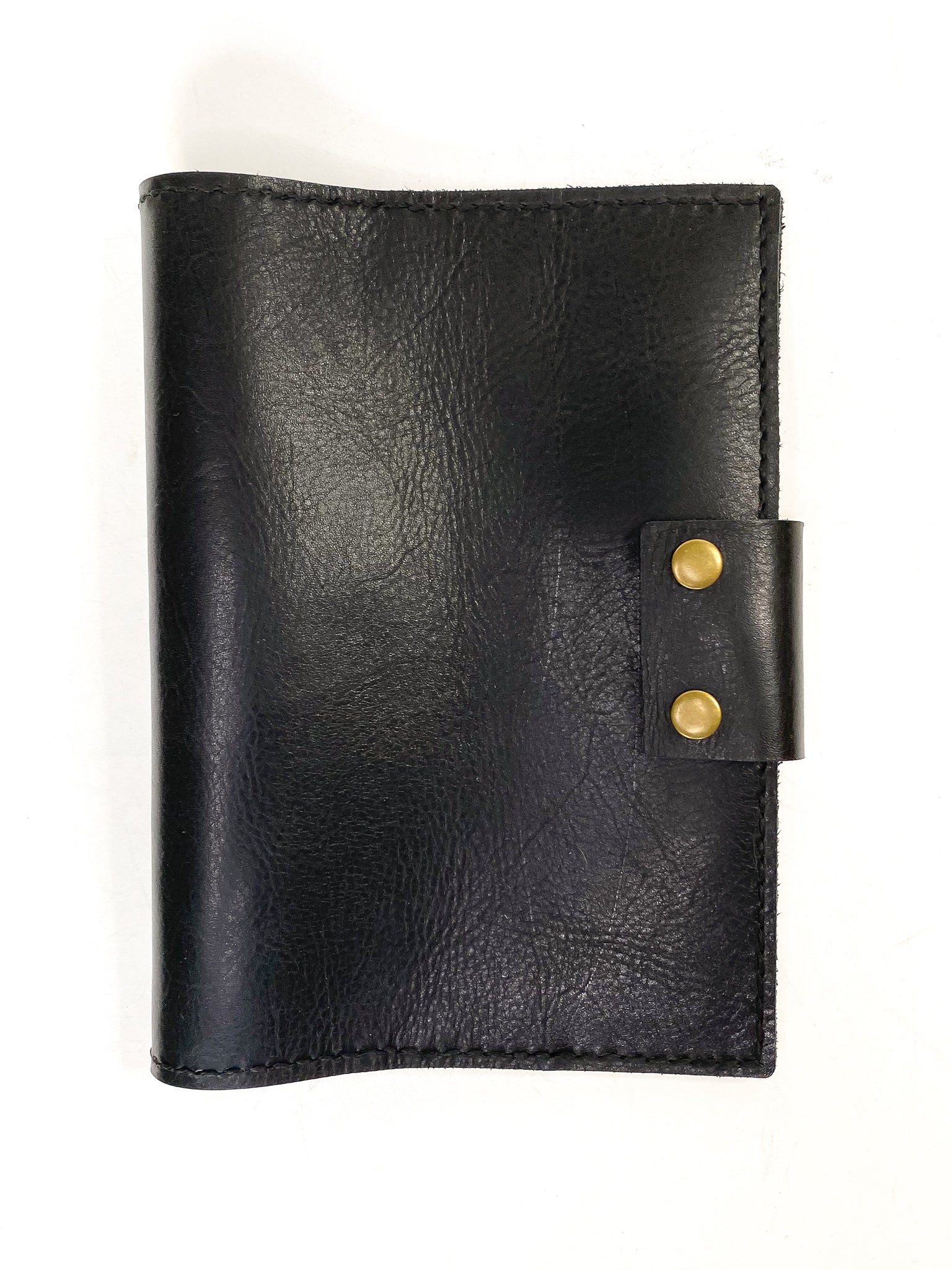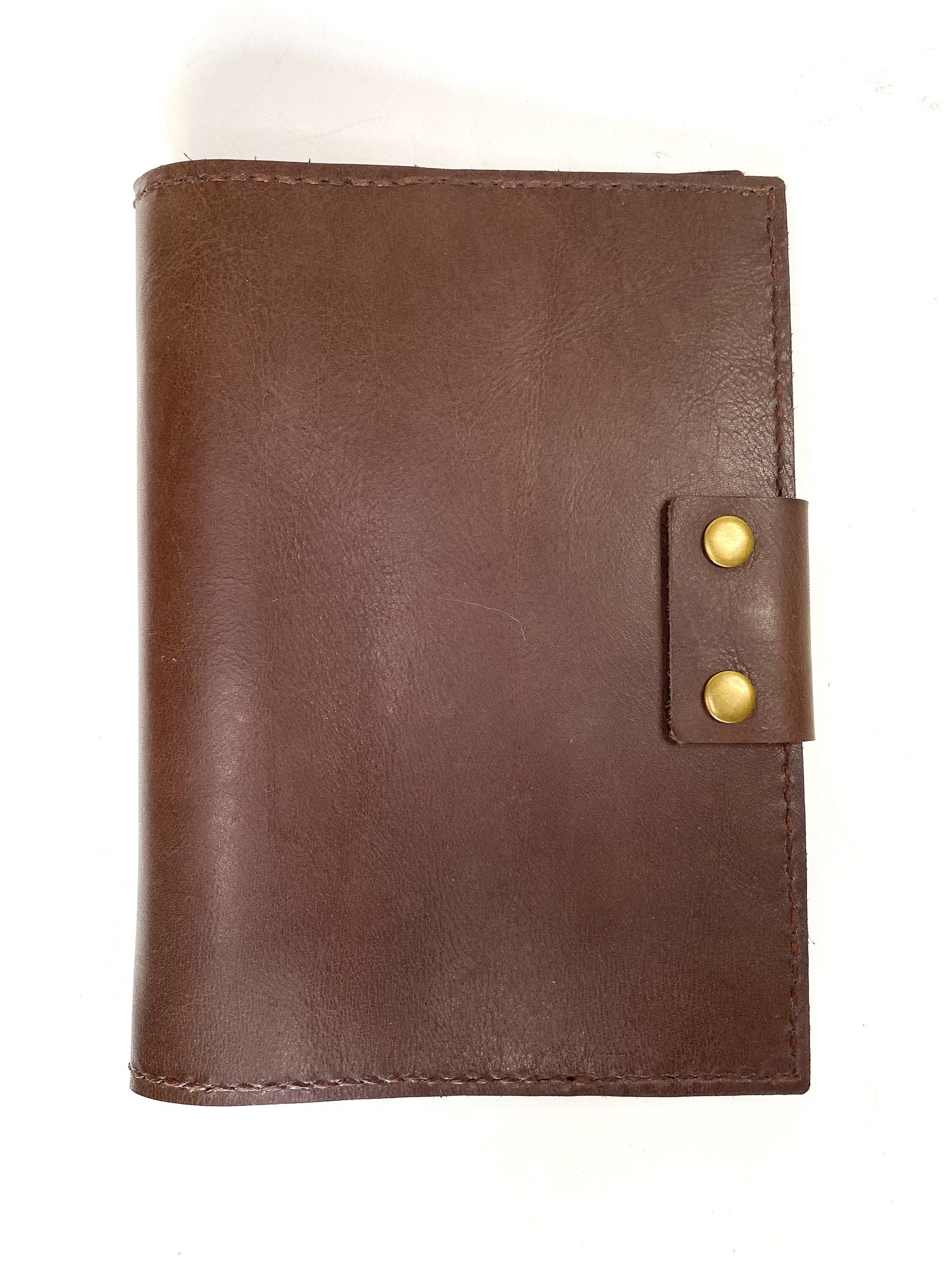 A5 Portfolio or book cover in pre-dyed bovine leather left unlined to showcase the robust, luxurious full-grain leather. A5 size, portrait orientation with left hand hinge (please contact us if you would prefer a landscape orientation). Custom sizes and configurations available on request.