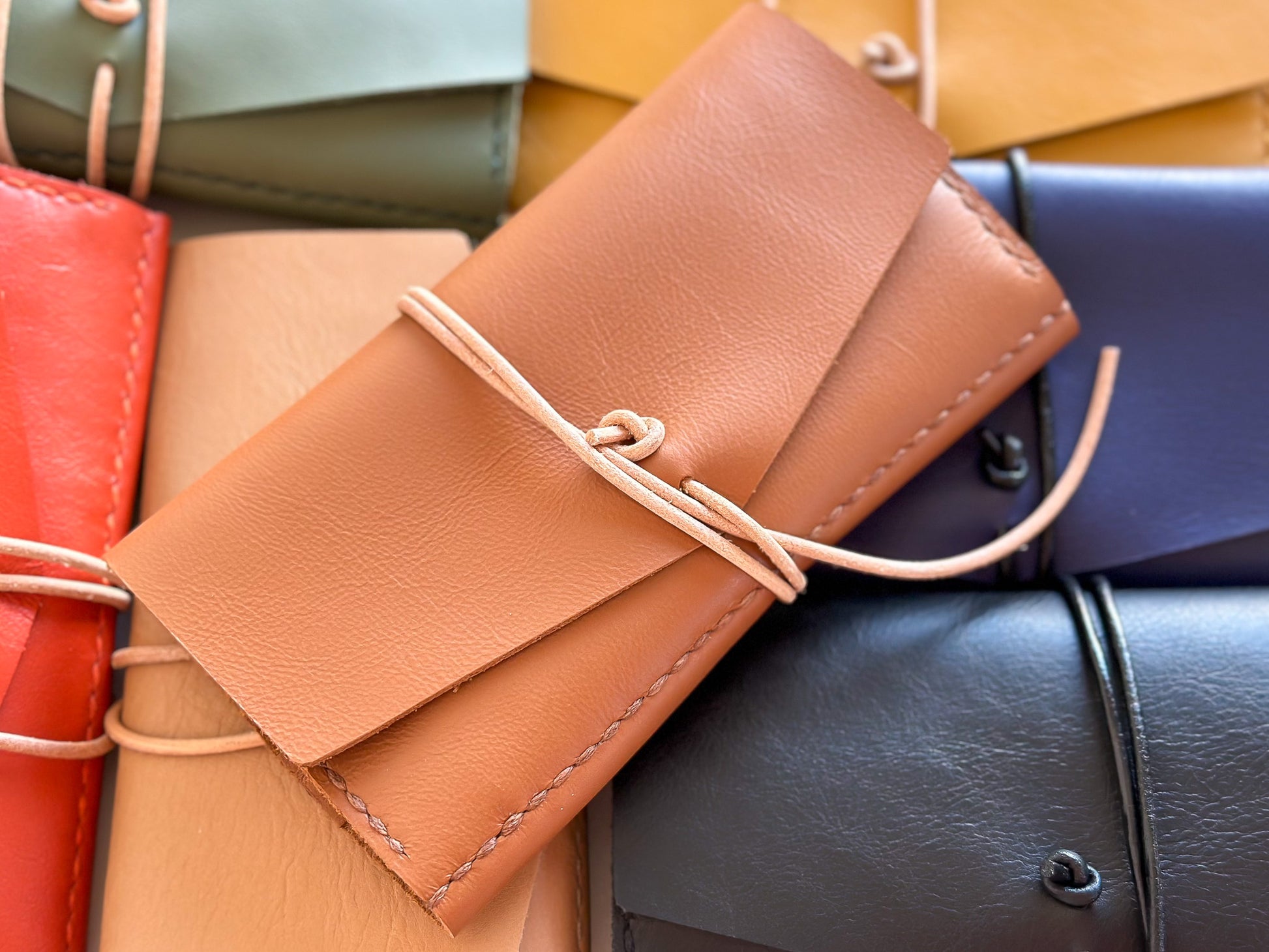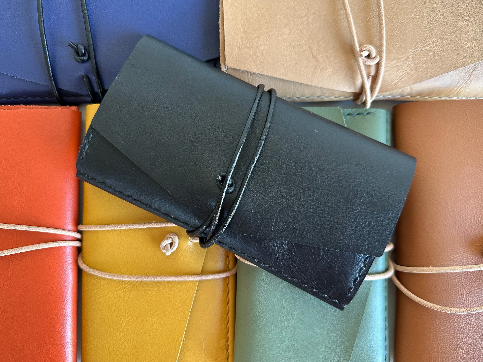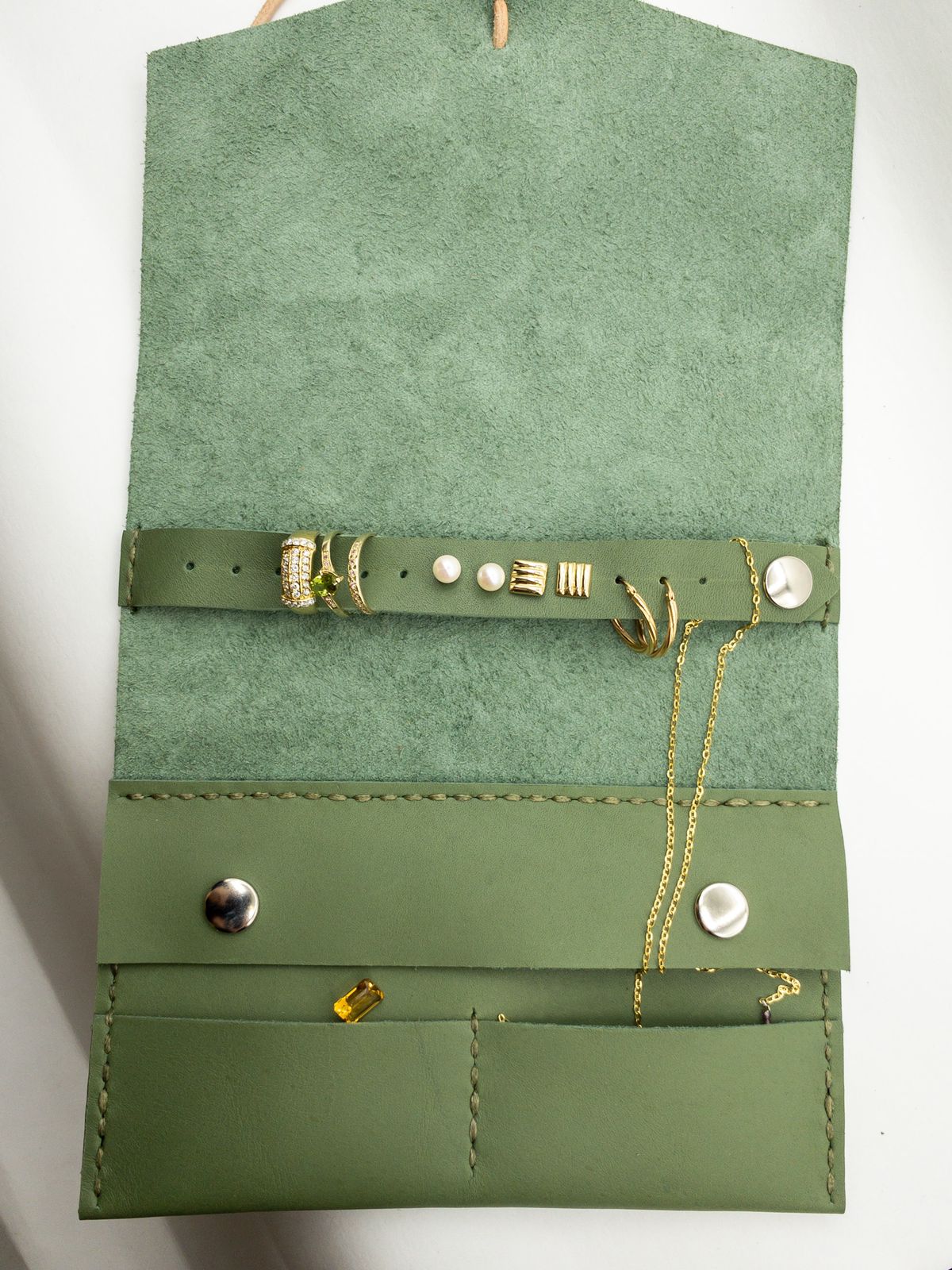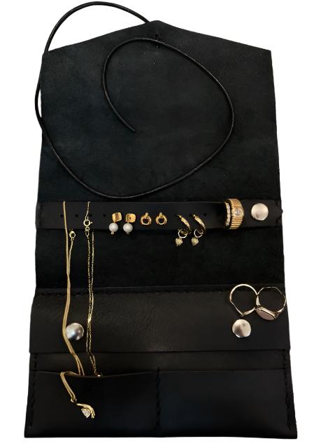 A versatile jewellery holder which features two pockets in addition to the main pouch and a strap for looping chains onto, threading through rings and with holes for holding earrings. The wrapping style and securing thong ensure your jewellery will not fall out inadvertently. The perfect travel companion.