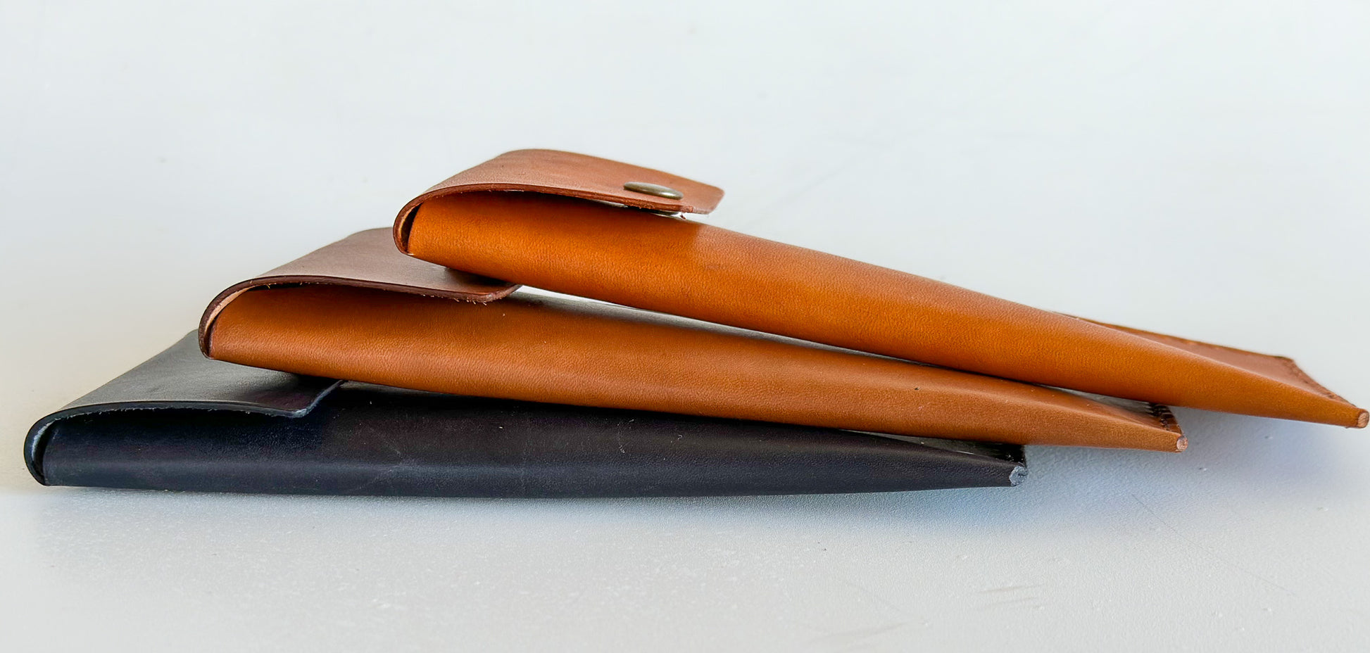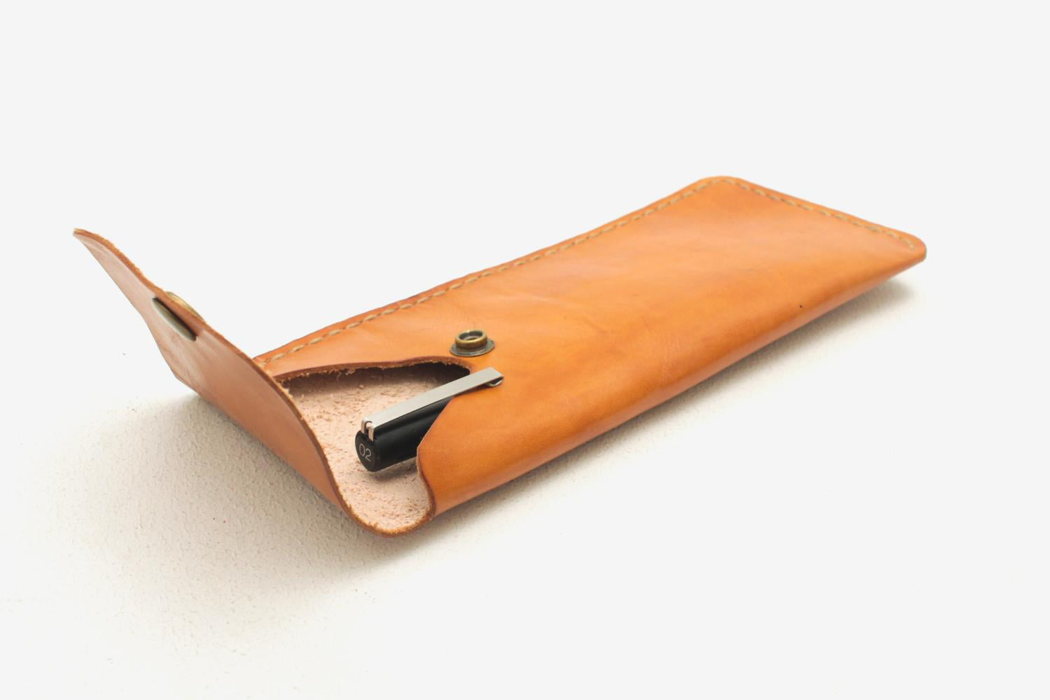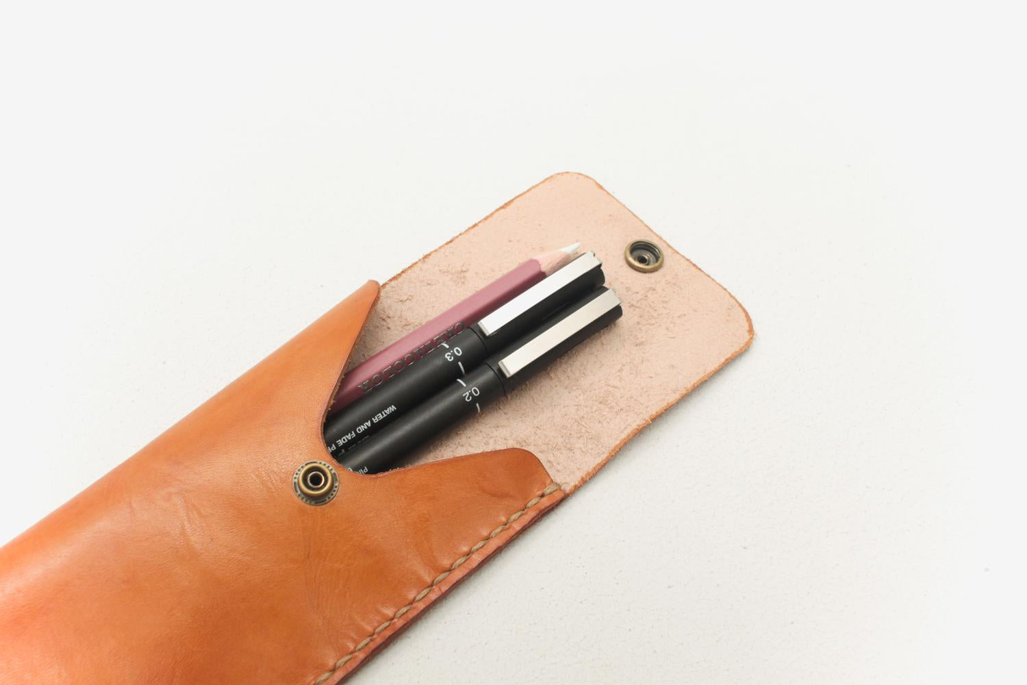 A pen wallet handmade from sustainable full grain natural vegtan calfskin leather that we hand dye.