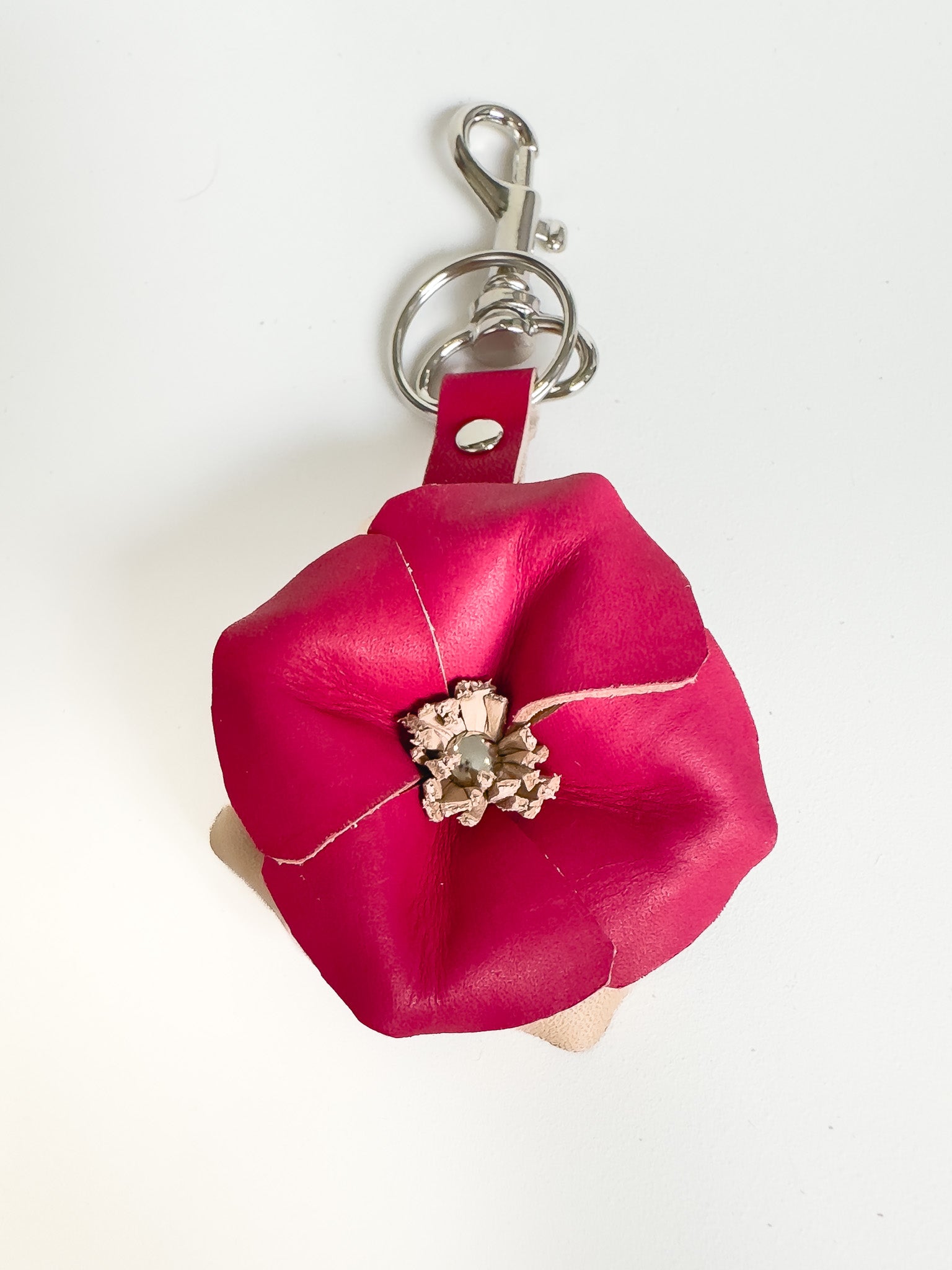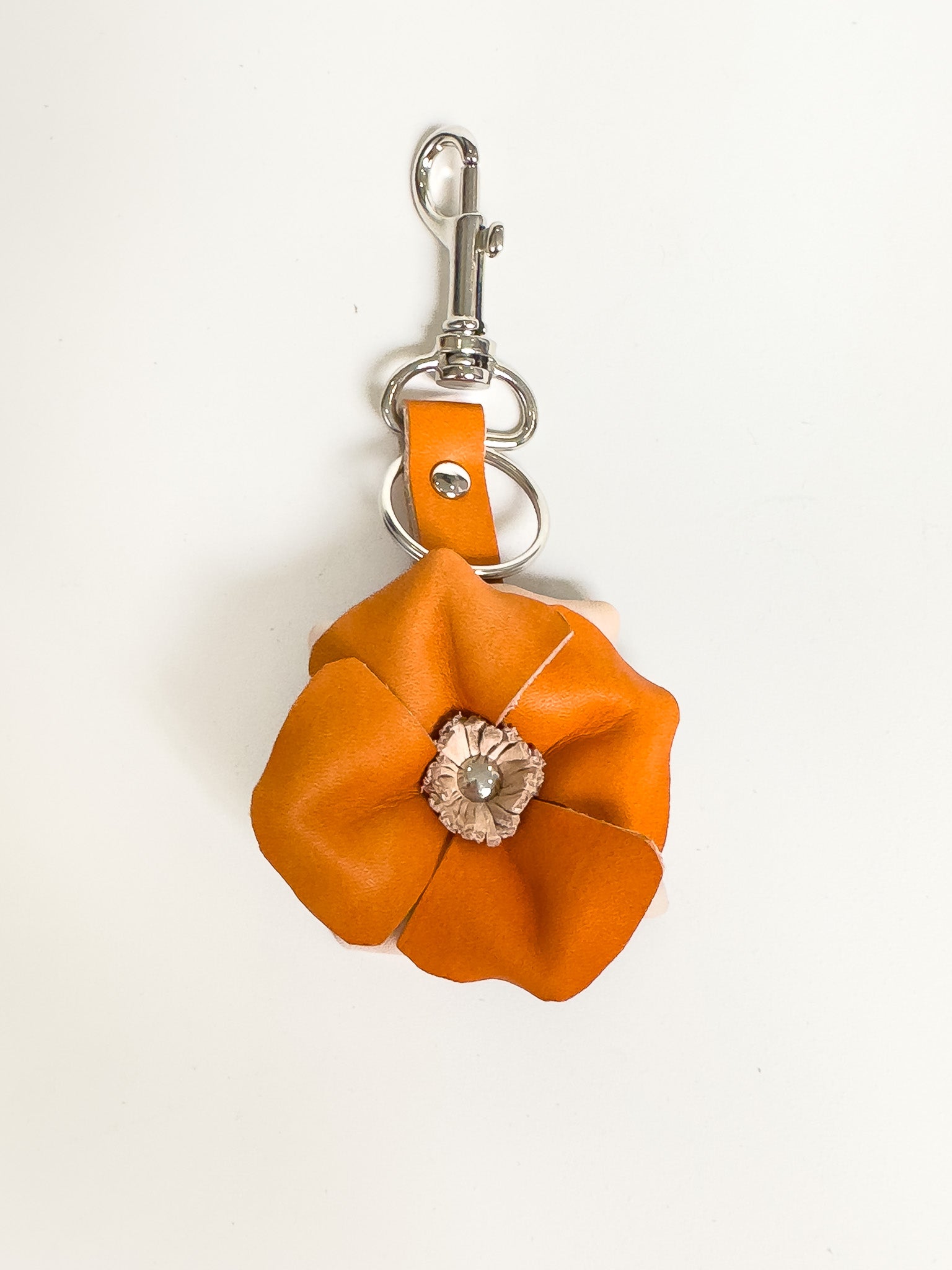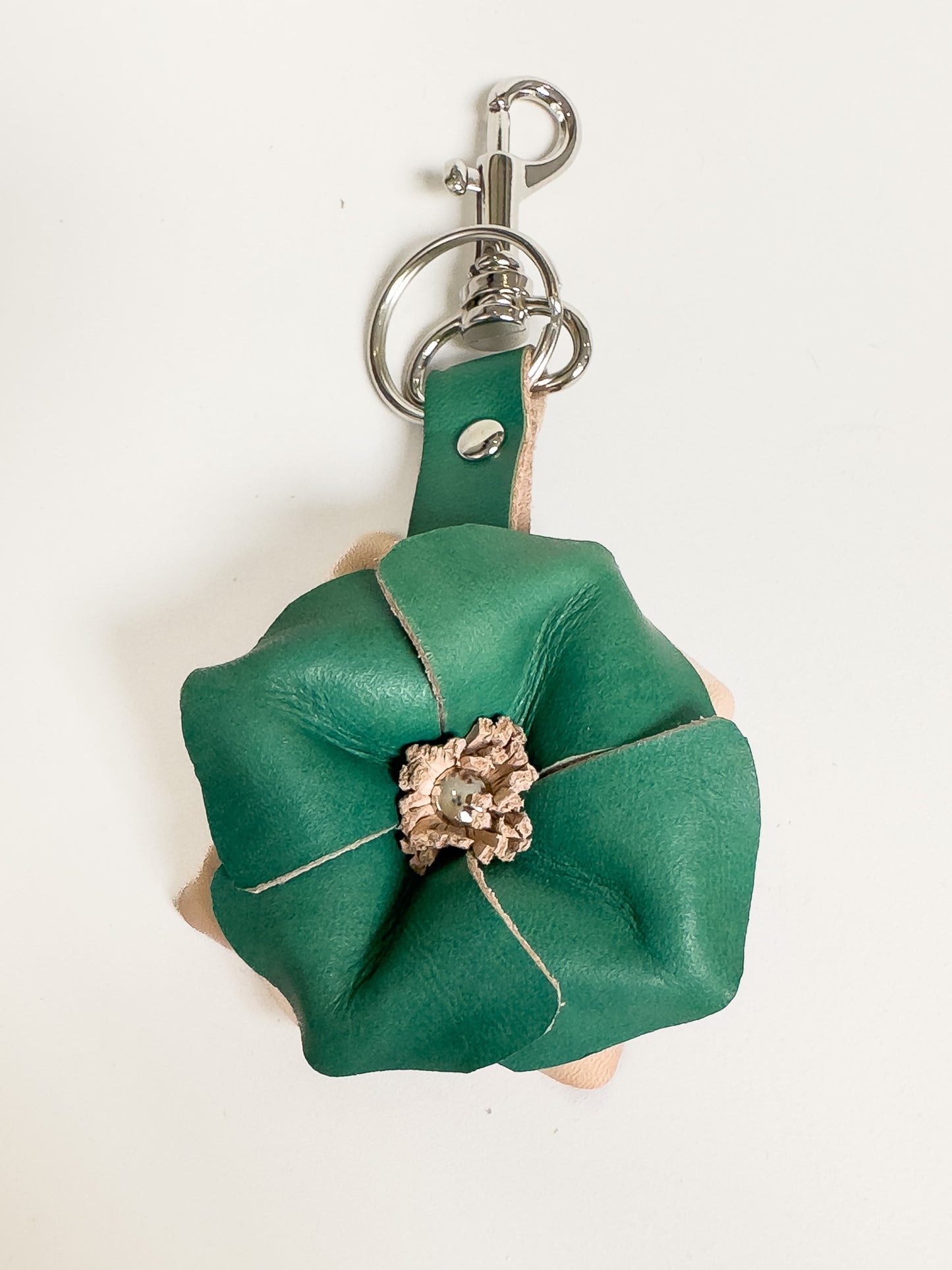 A handmade full-grain leather flower key fob with a nickel-plated quick release trigger hook.