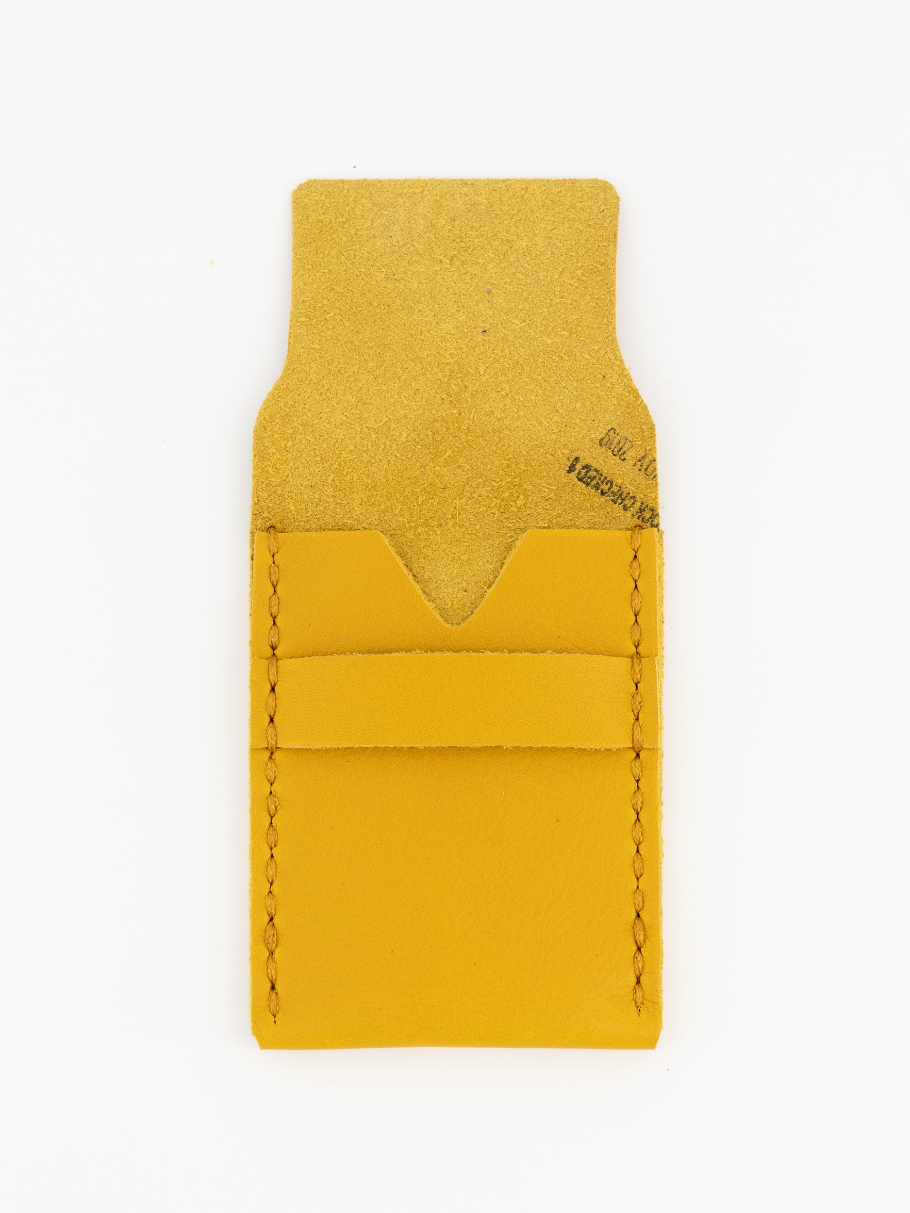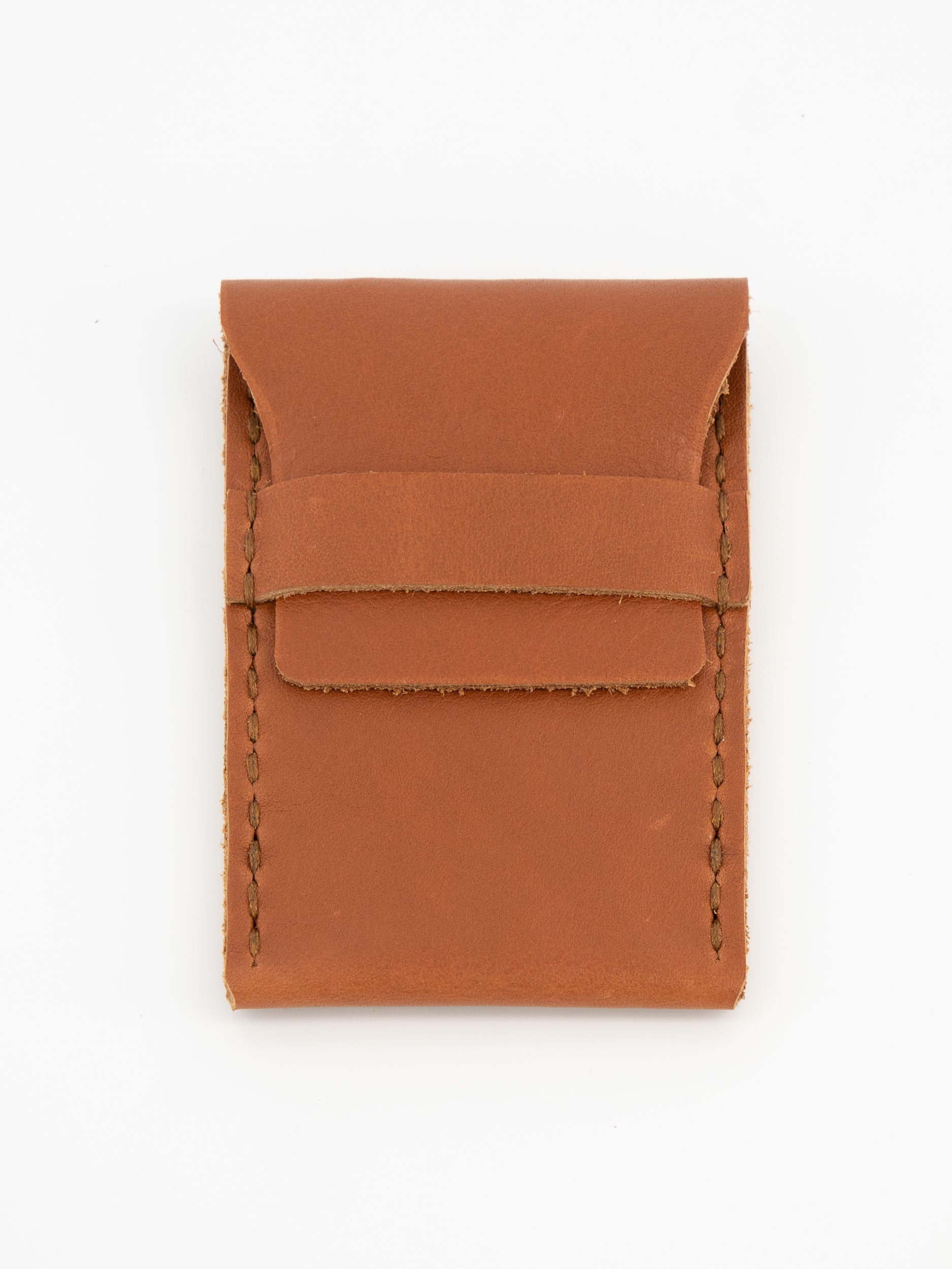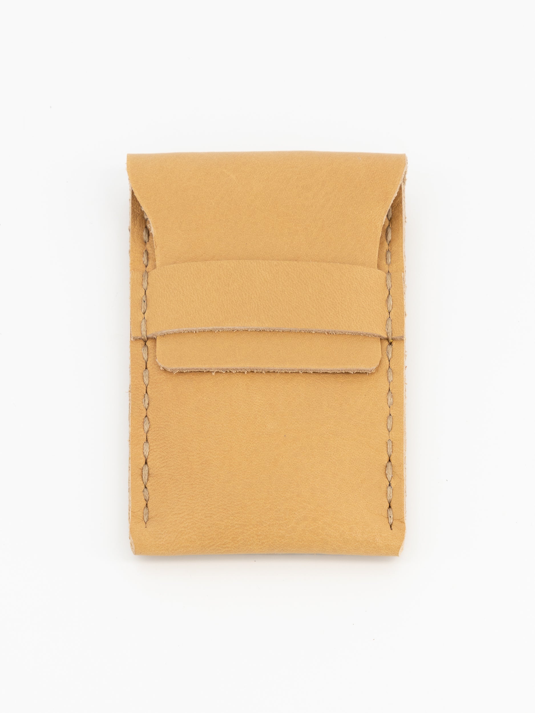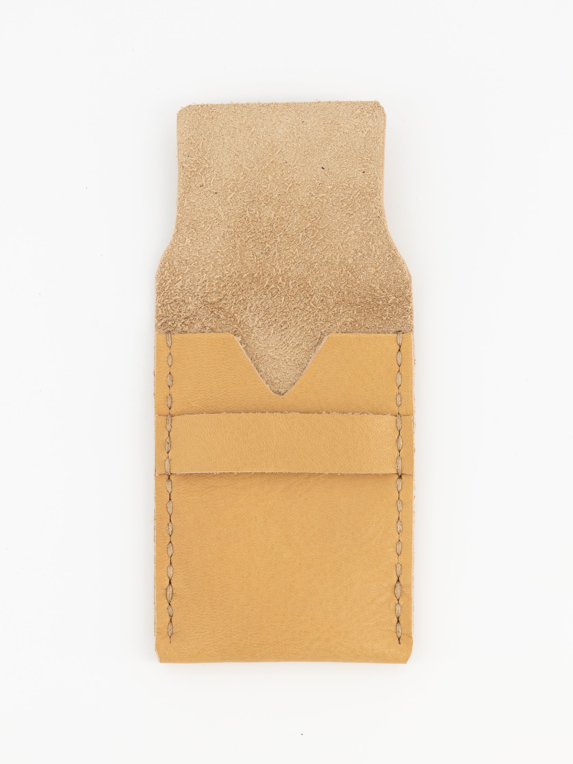 Full-grain bovine leather. A full-grain leather two-pocket card wallet/sleeve - one closed by a flap and an open-topped one at the back. Handmade and hand stitched.