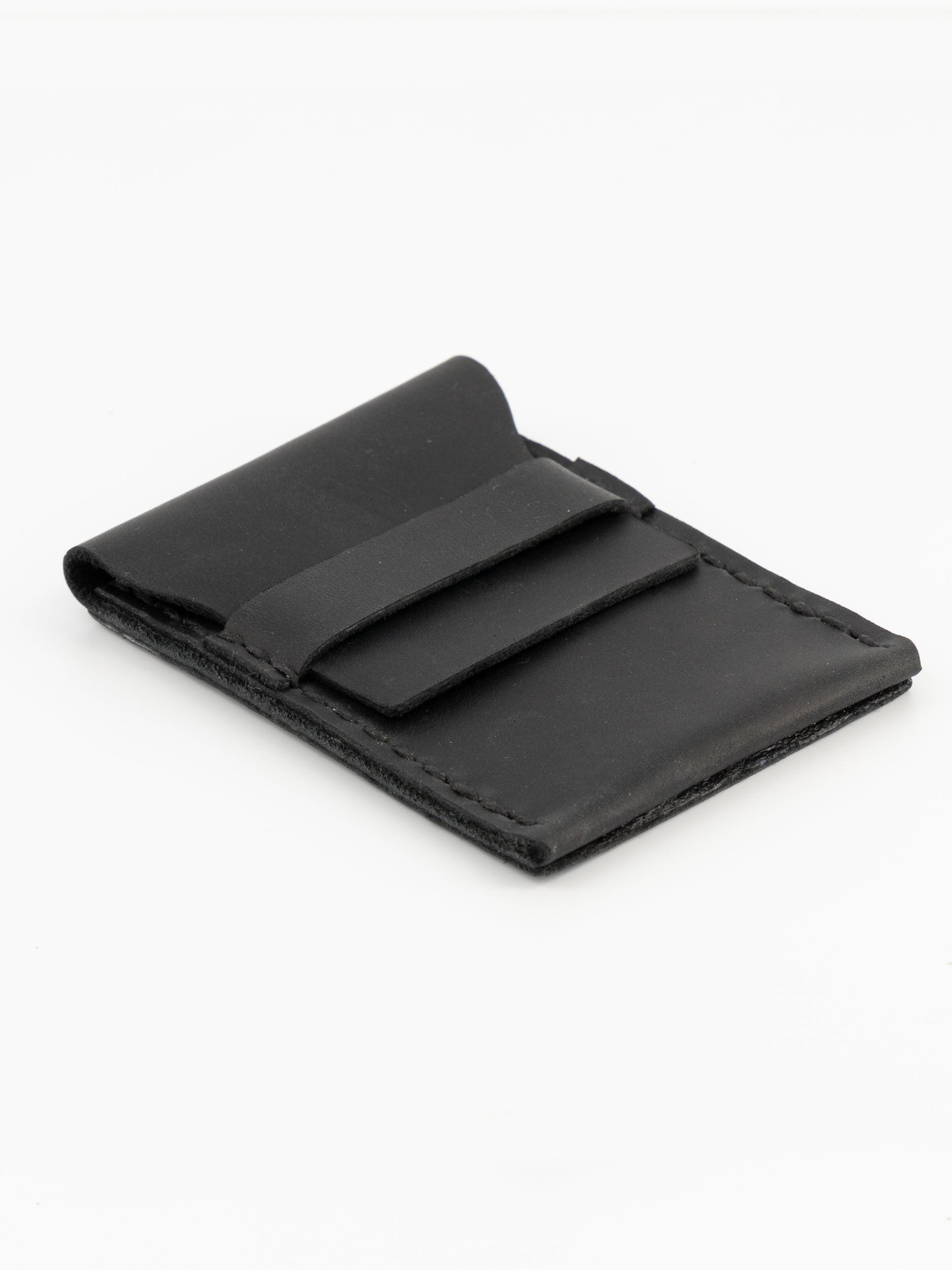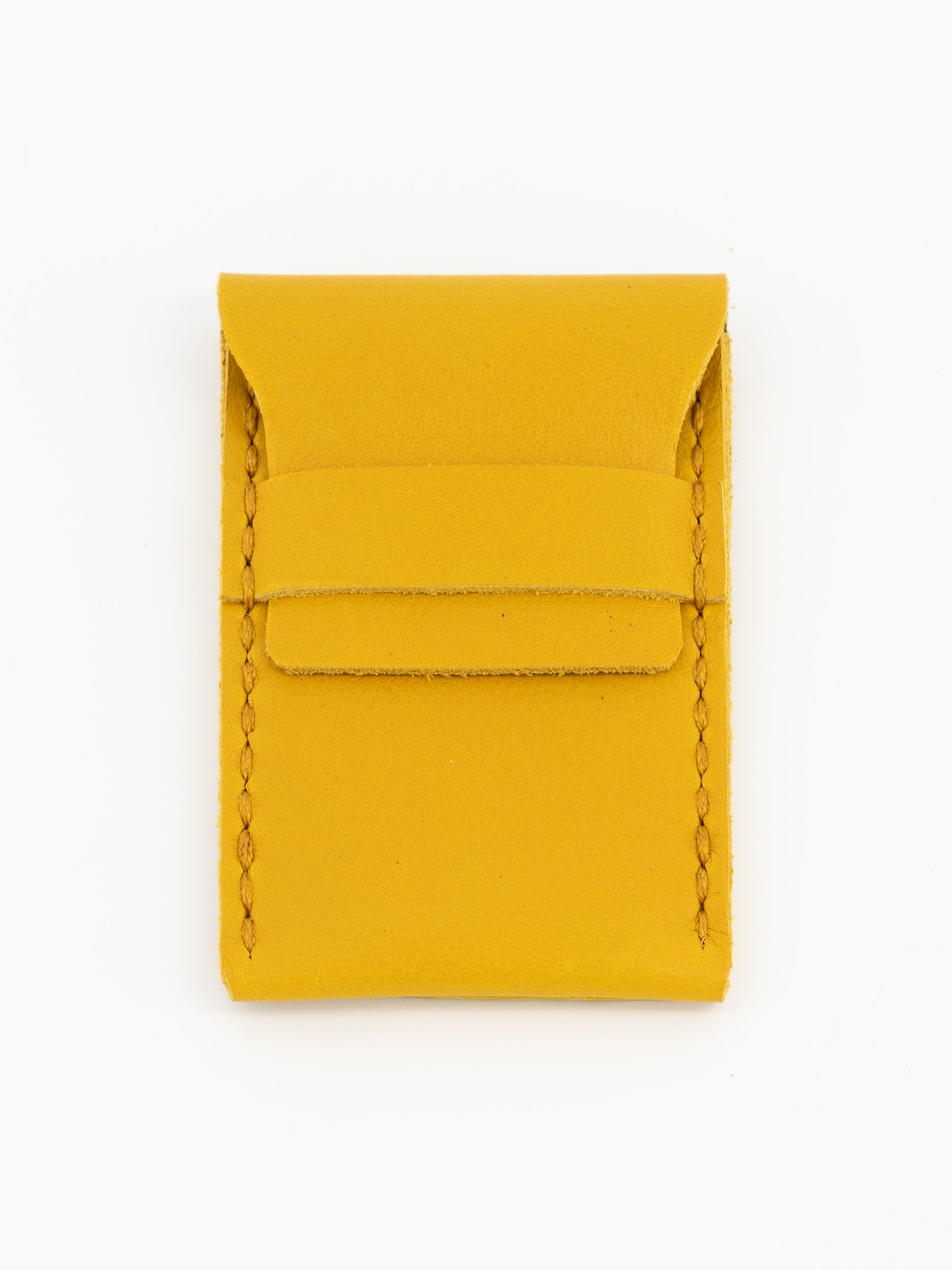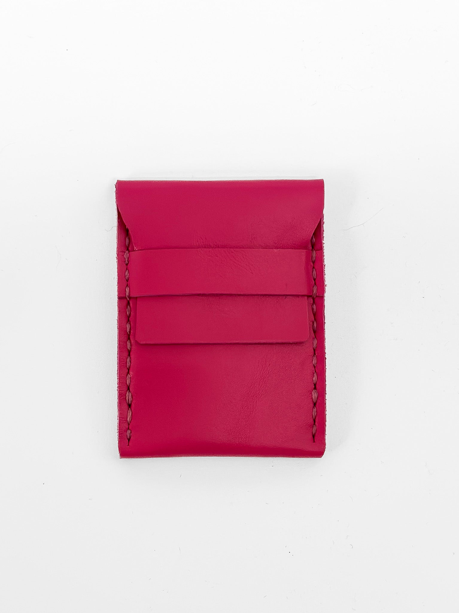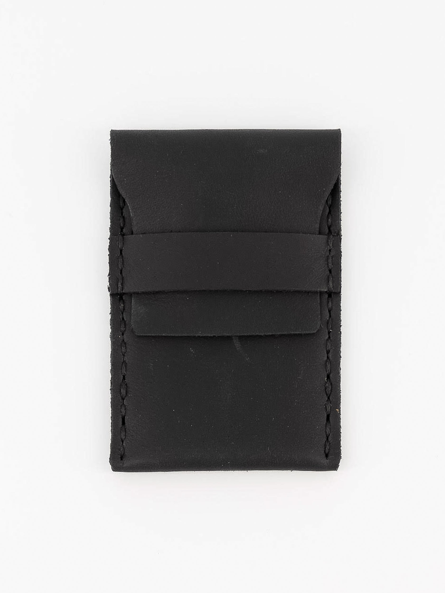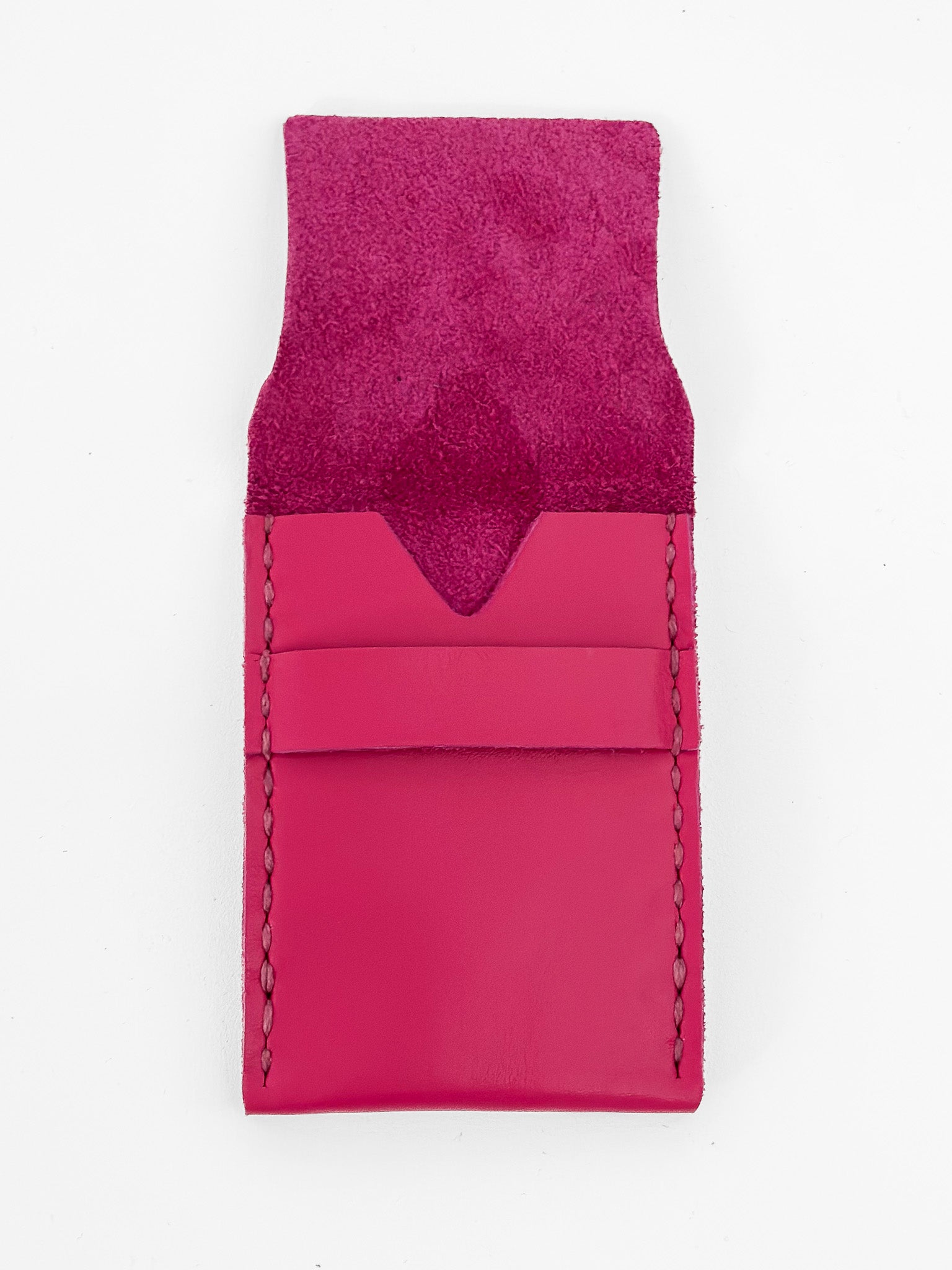 Full-grain bovine leather. A full-grain leather two-pocket card wallet/sleeve - one closed by a flap and an open-topped one at the back. Handmade and hand stitched.