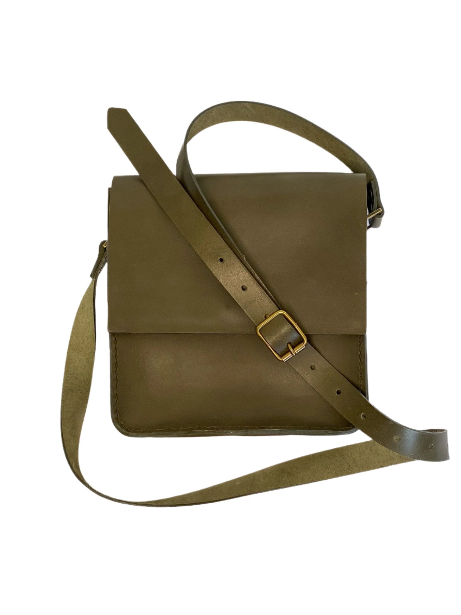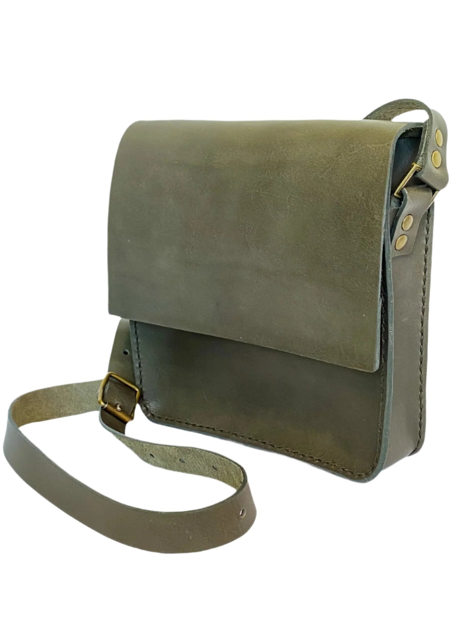 A compact contemporary messenger bag, handmade and handstitched from soft full-grain leather and left unlined. There is an inside pocket. The closing flap is secured with a magnet. This bag is an elegant rework of the traditional messenger bag.