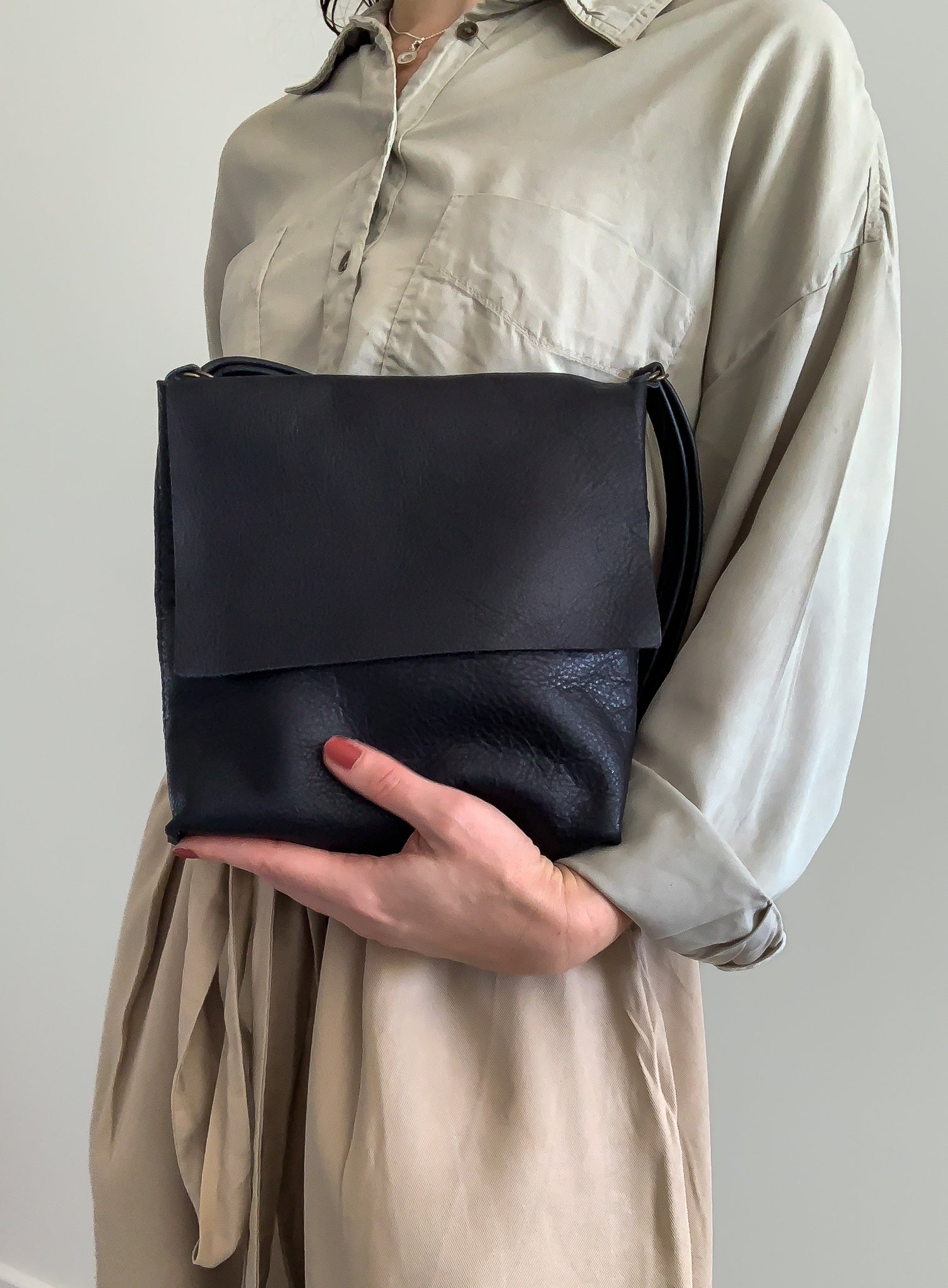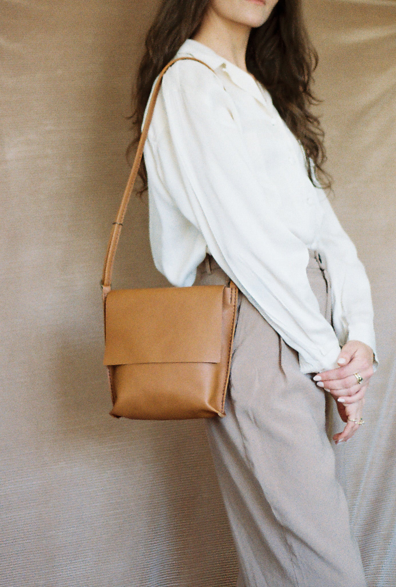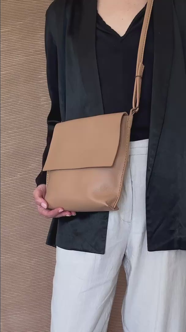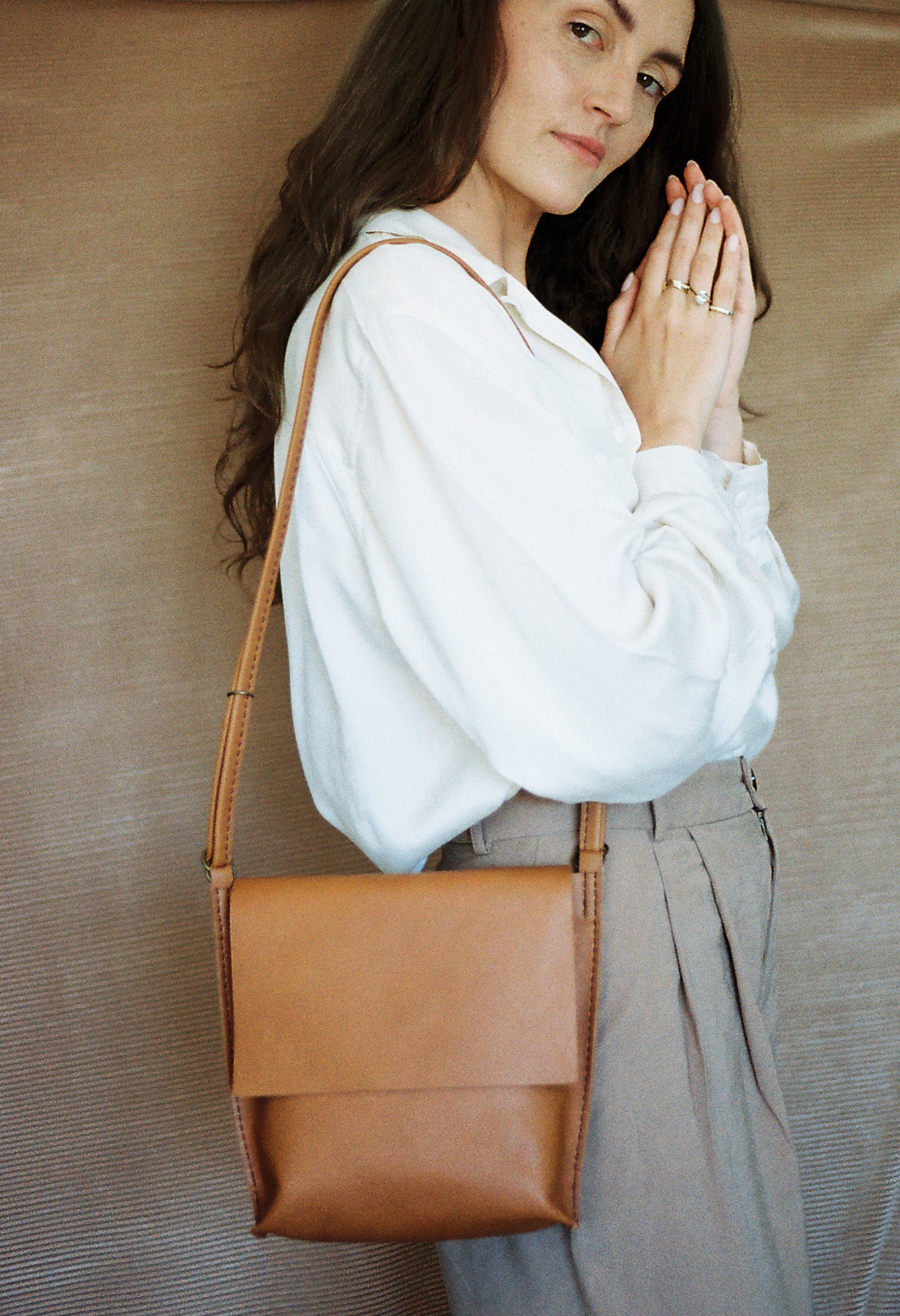 The Newbrown is a versatile sling bag that features soft folds and traditional inspiration to create a practical, easy to wear bag. Wear it cross-body, cropped underarm or choose anywhere in between. There is an inside pocket. The opening of the bag is securely held closed with a strong magnet and is covered by the free falling front flap.