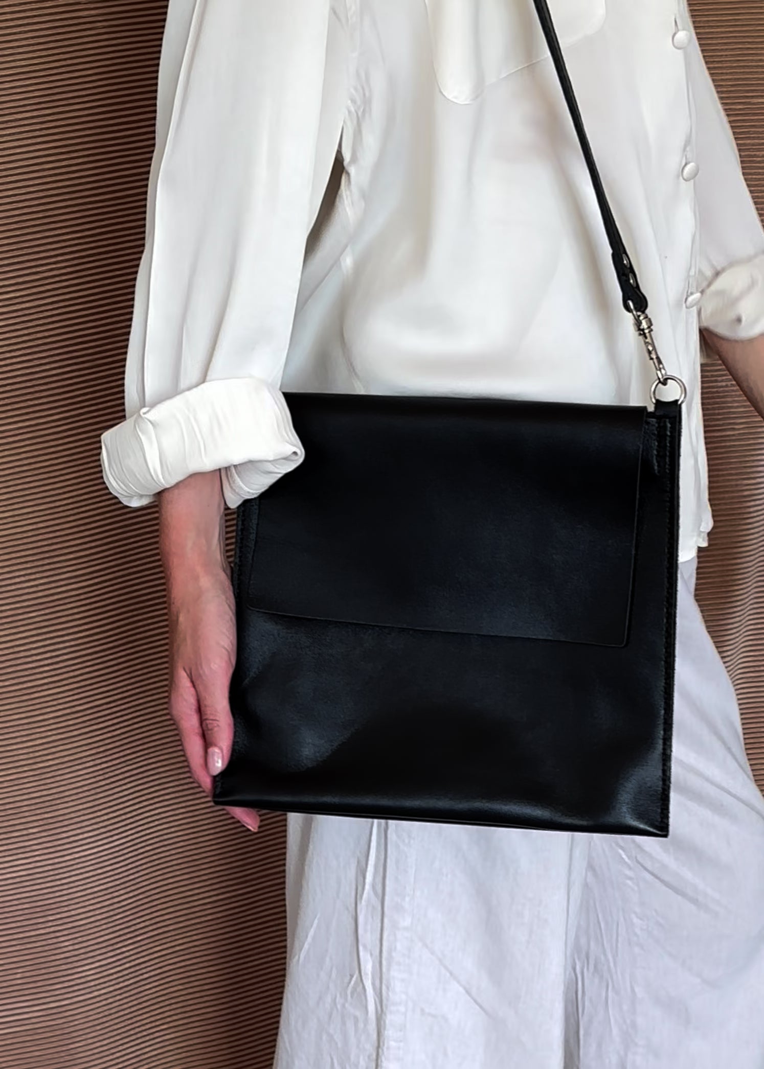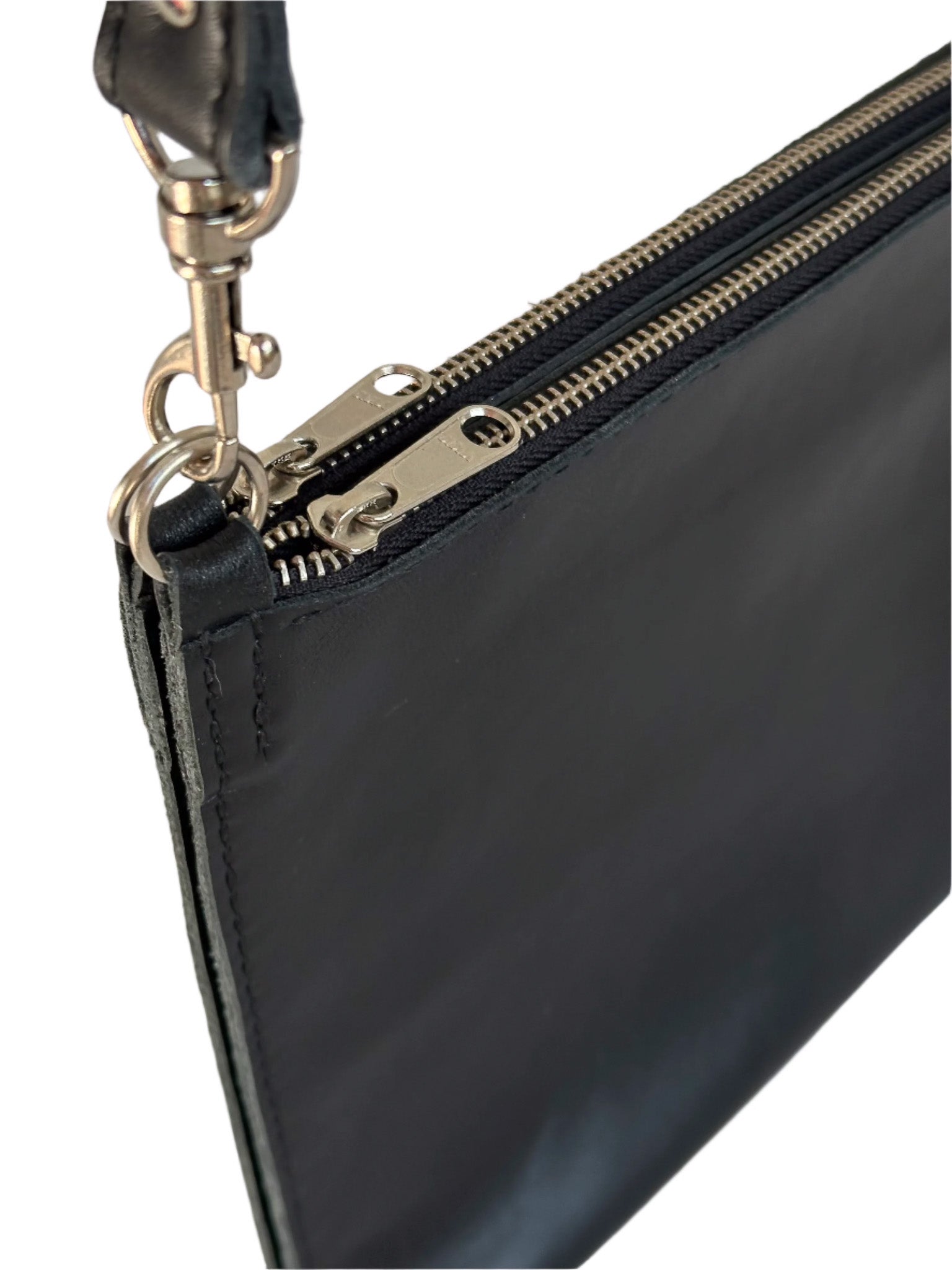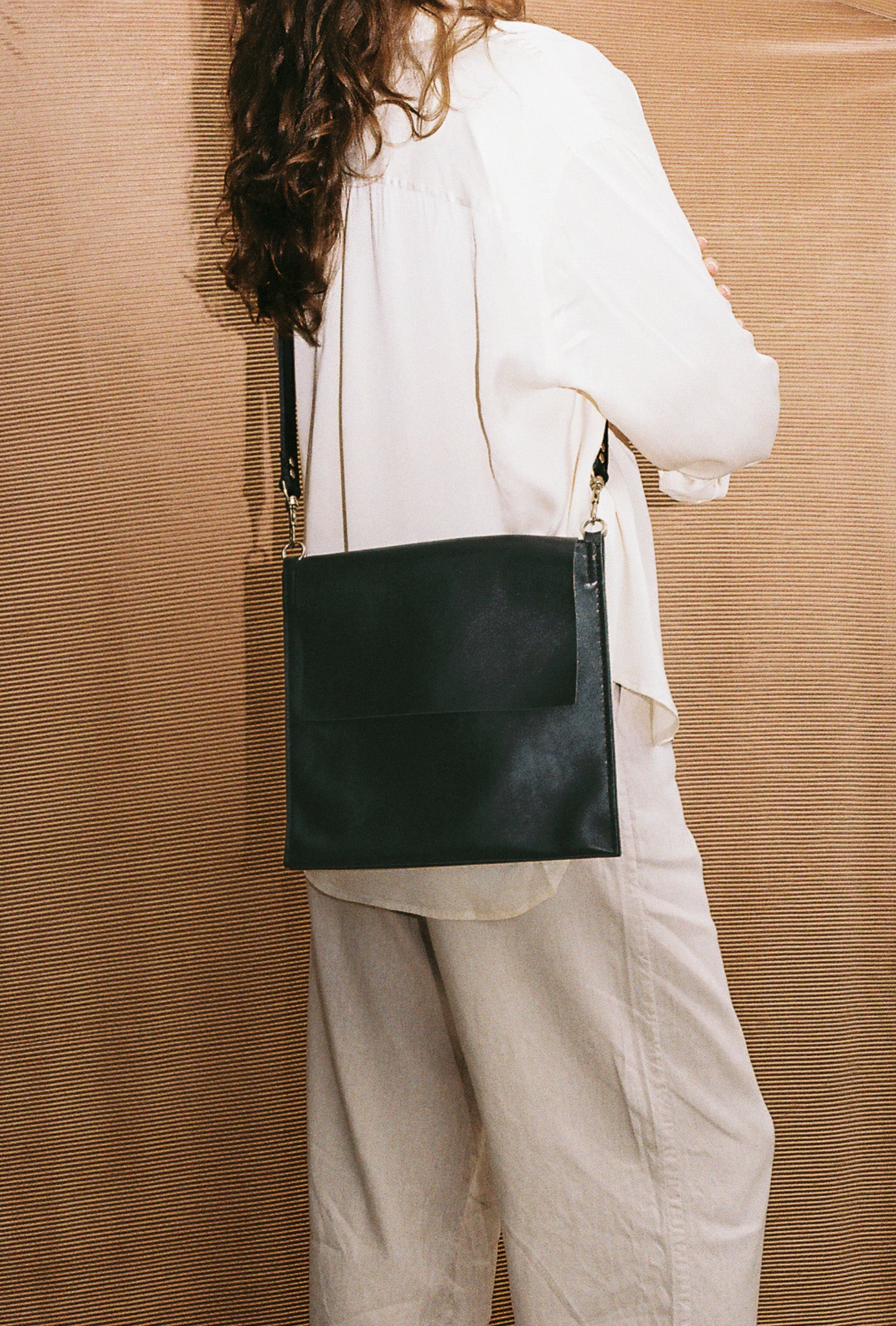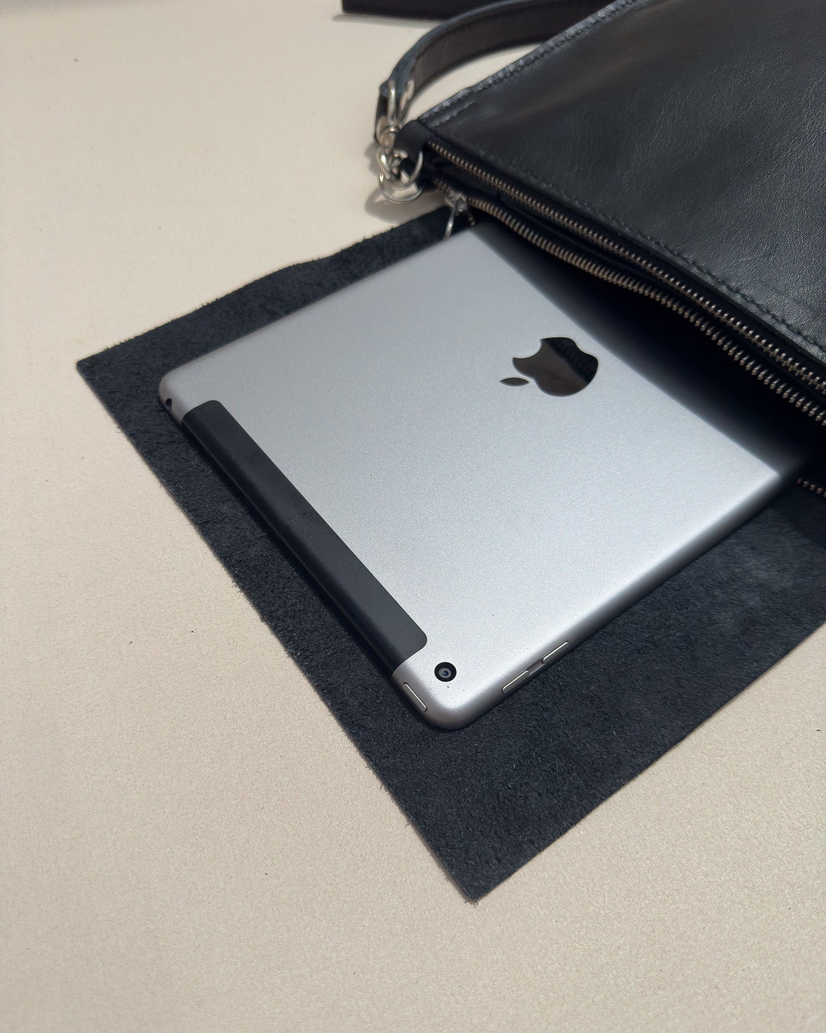 We’ve made a stylish, practical everyday bag with a small profile yet big carrying capacity. It consists of the two main zipped compartments, a central unzipped compartment for quick access items and one big inner pocket. The bag is sized big enough to accommodate a tablet device. The strap is sturdy and adjustable.