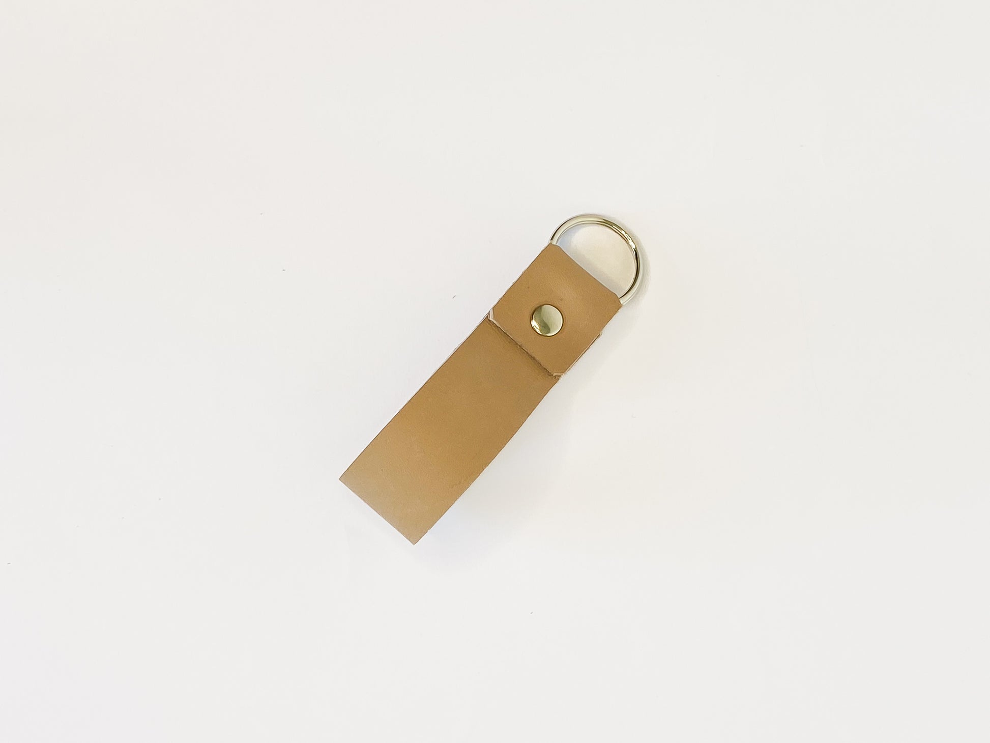 A handmade full-grain leather key ring featuring a looped and riveted leather tag.